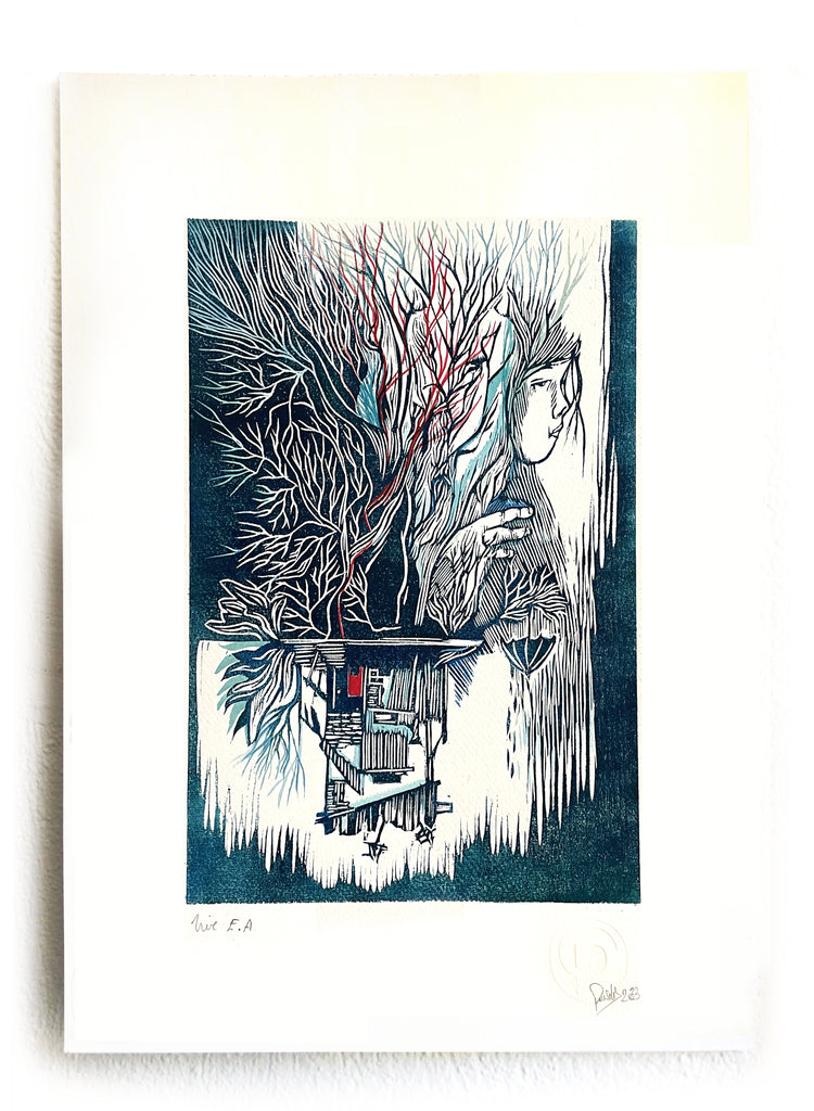 Gravure sur bois, estampe originale imprimée à la main et rehaussée à l’aquarelle.